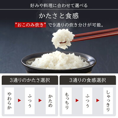圧力をかけることで冷めても美味しいもちもちとした食感に!おこのみ炊きでかたさと食感など、9通りの炊き分けが可能。